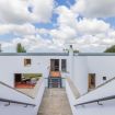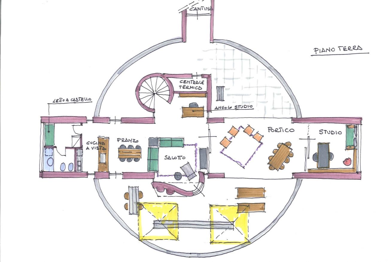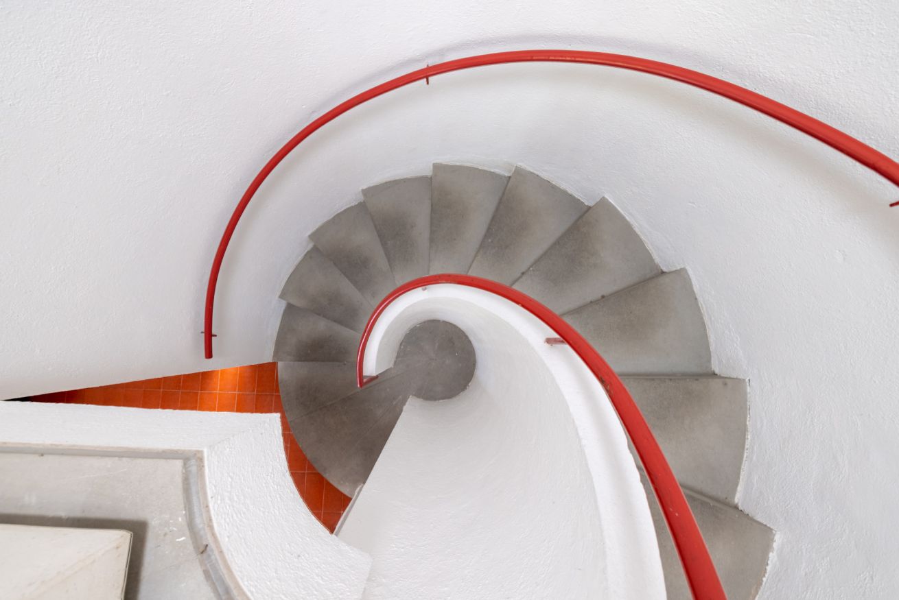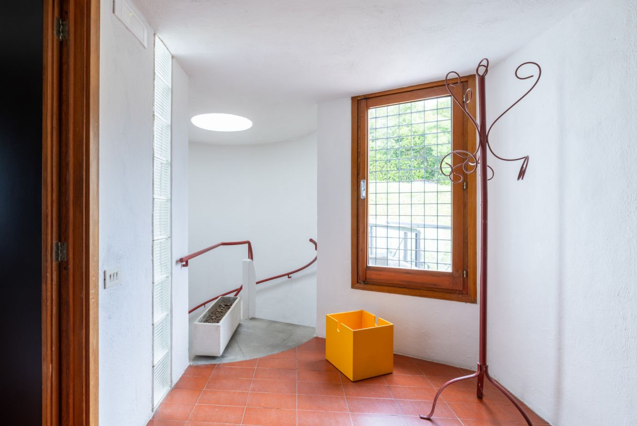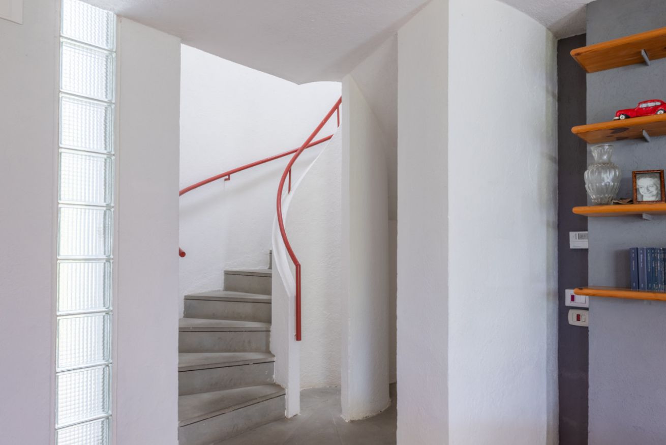 Attraverso una scala elicoidale situata in un volume cilindrico adiacente alla casa principale, si scende al piano inferiore, dove si trova la zona soggiorno che, insieme alla cucina e all'area pranzo, costituisce un ampio spazio aperto. Il piano inferiore include anche una piccola camera da letto, un bagno, lo studio dell'Arch. Lambertucci (separato dalla casa tramite il portico), un locale tecnico che funge anche da magazzino, collocato esternamente alla casa, sotto la scalinata che conduce al ponte in acciaio.
